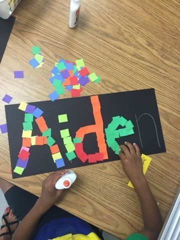 - Lettermozaïeken; dit idee heb ik gevonden op https://www.mamaliefde.nl/ het idee hiervan is dat de kleuter een blad krijgt waar zijn of haar naam op geschreven staat en strookjes of blokjes papier. De kleuter plakt met lijm de stukjes papier op de letters van zijn of haar naam en zo verschijnt de naam van het kind. Bekijk ook de foto voor een visuele uitleg.